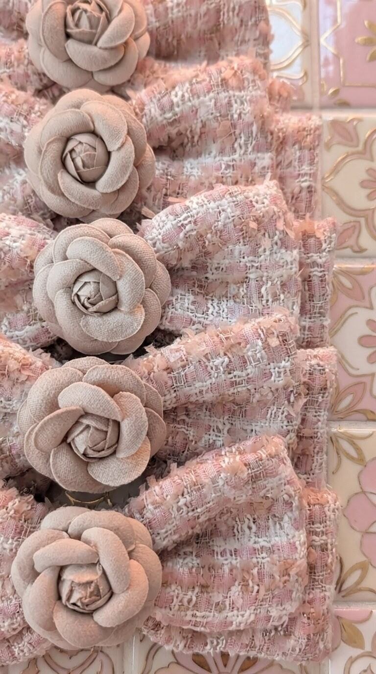 ピンク×ベージュにラメ糸を編み込んだ珍しい組み合わせのツイード生地。
