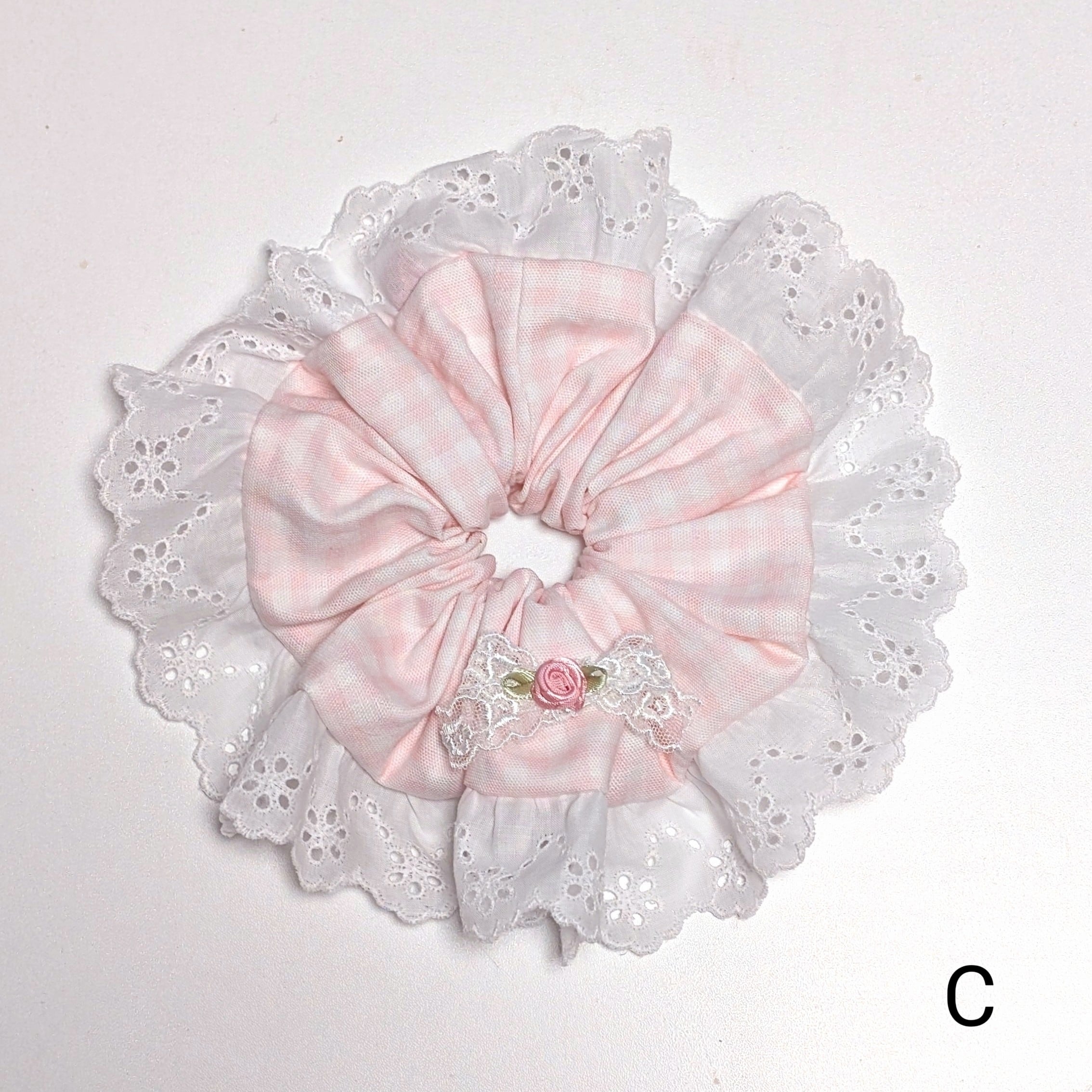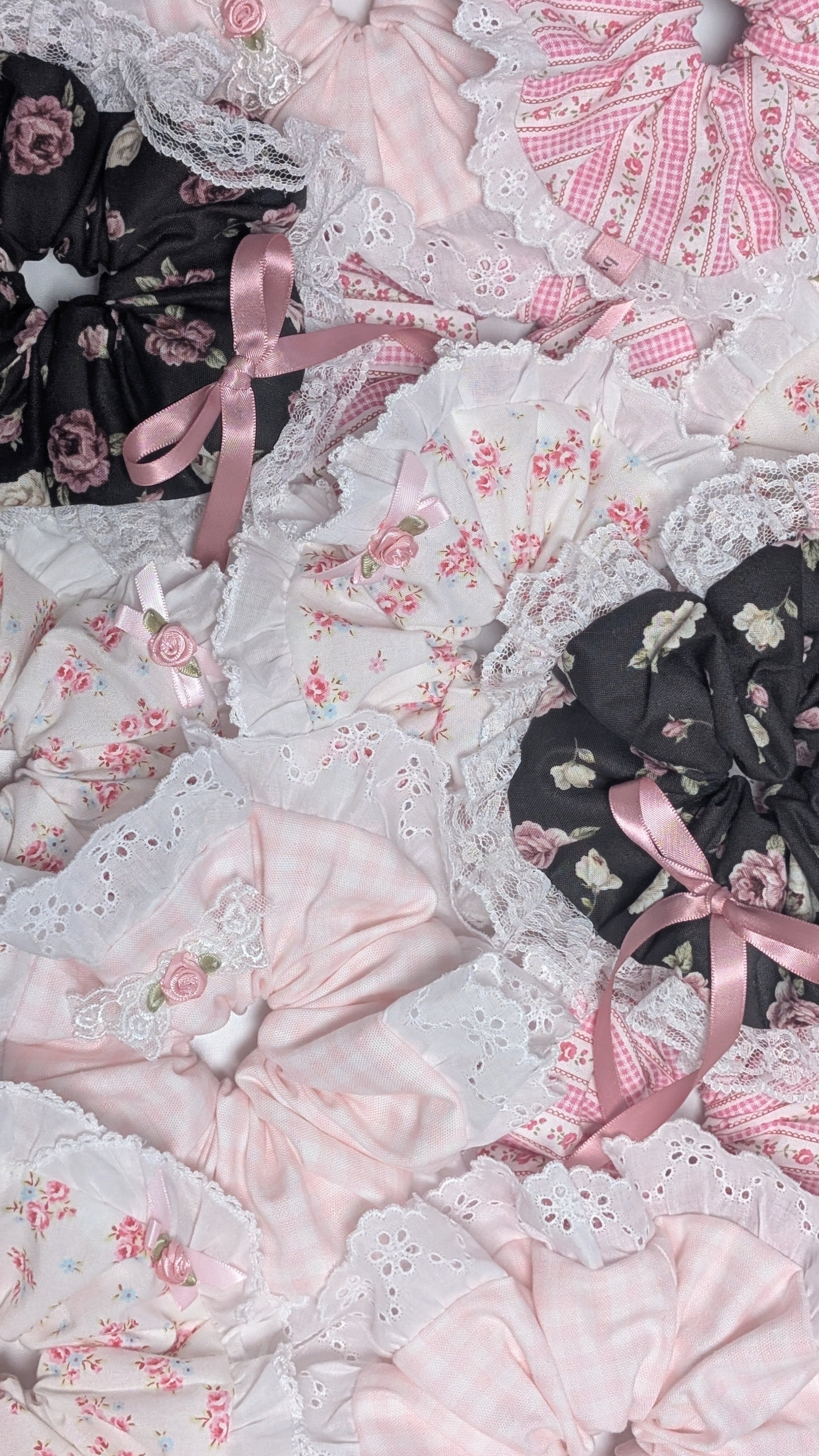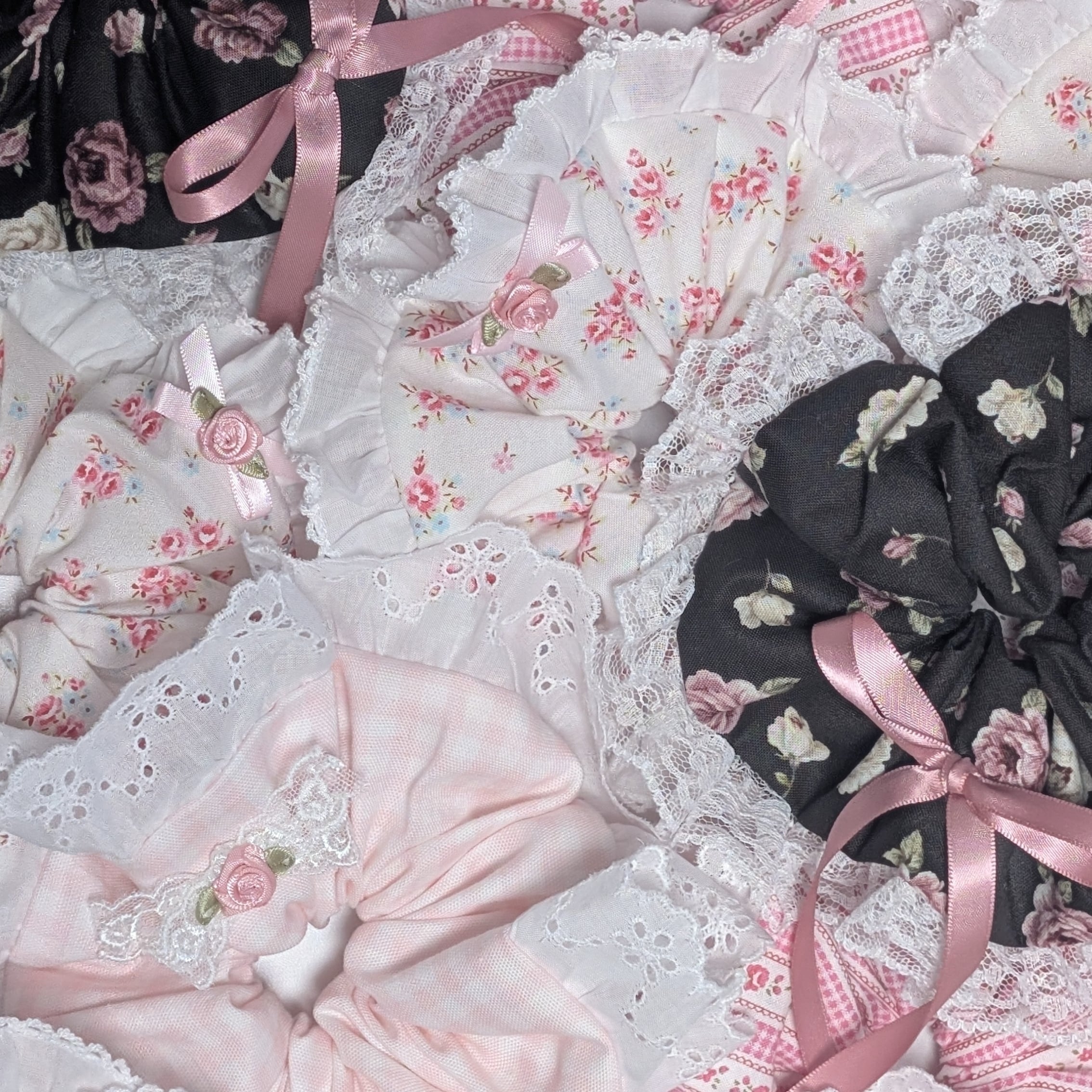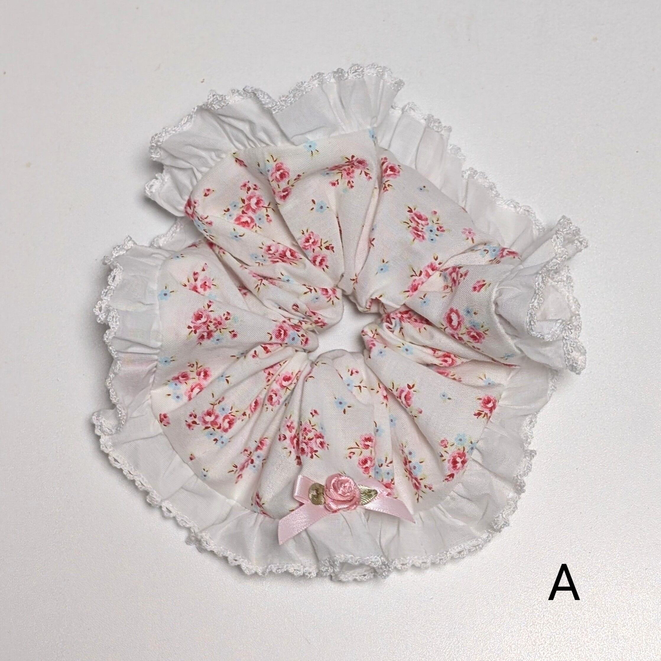 ROSE CLUBらしい華やかなデザインの生地とフリルの組み合わせのシュシュ