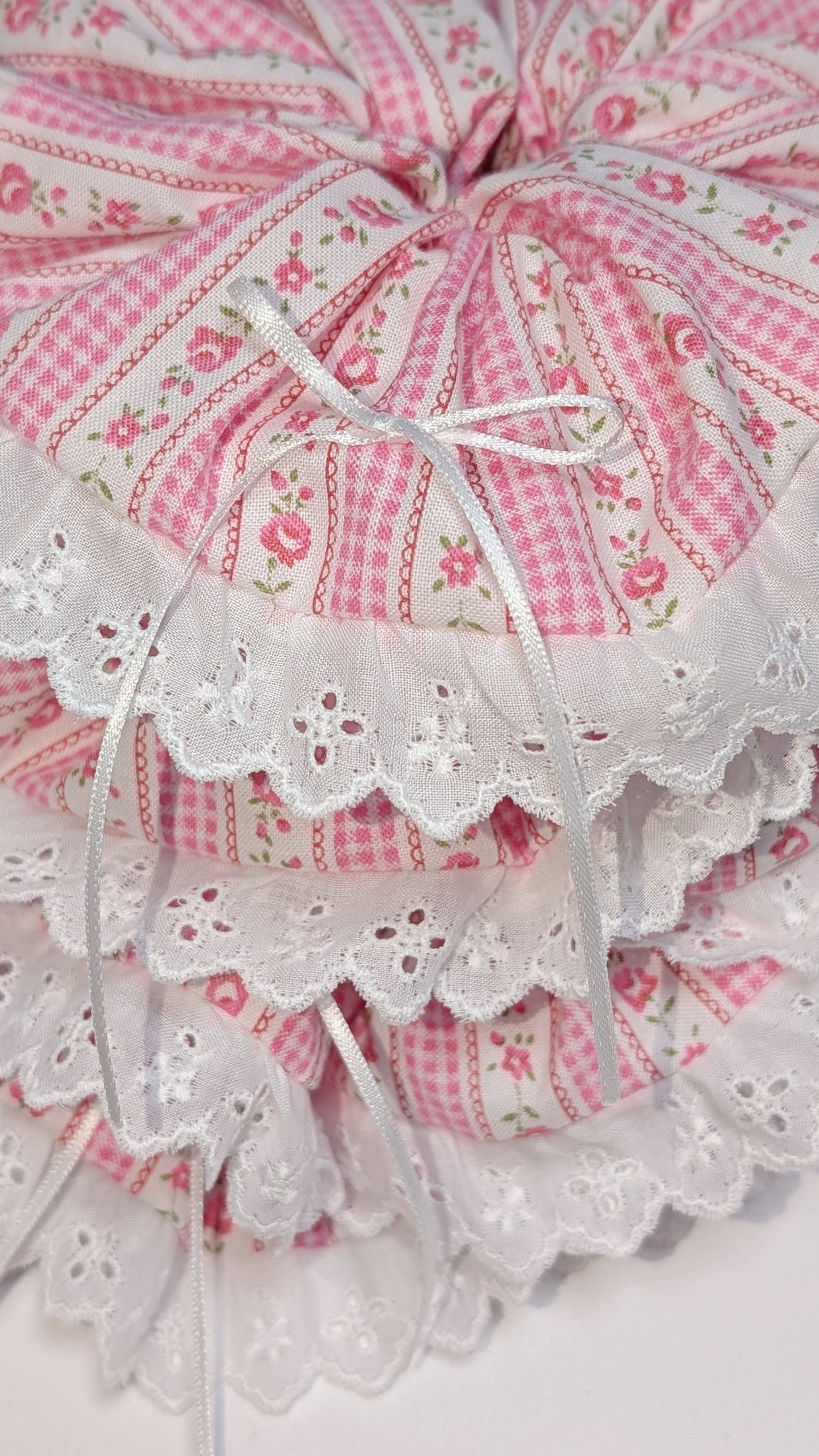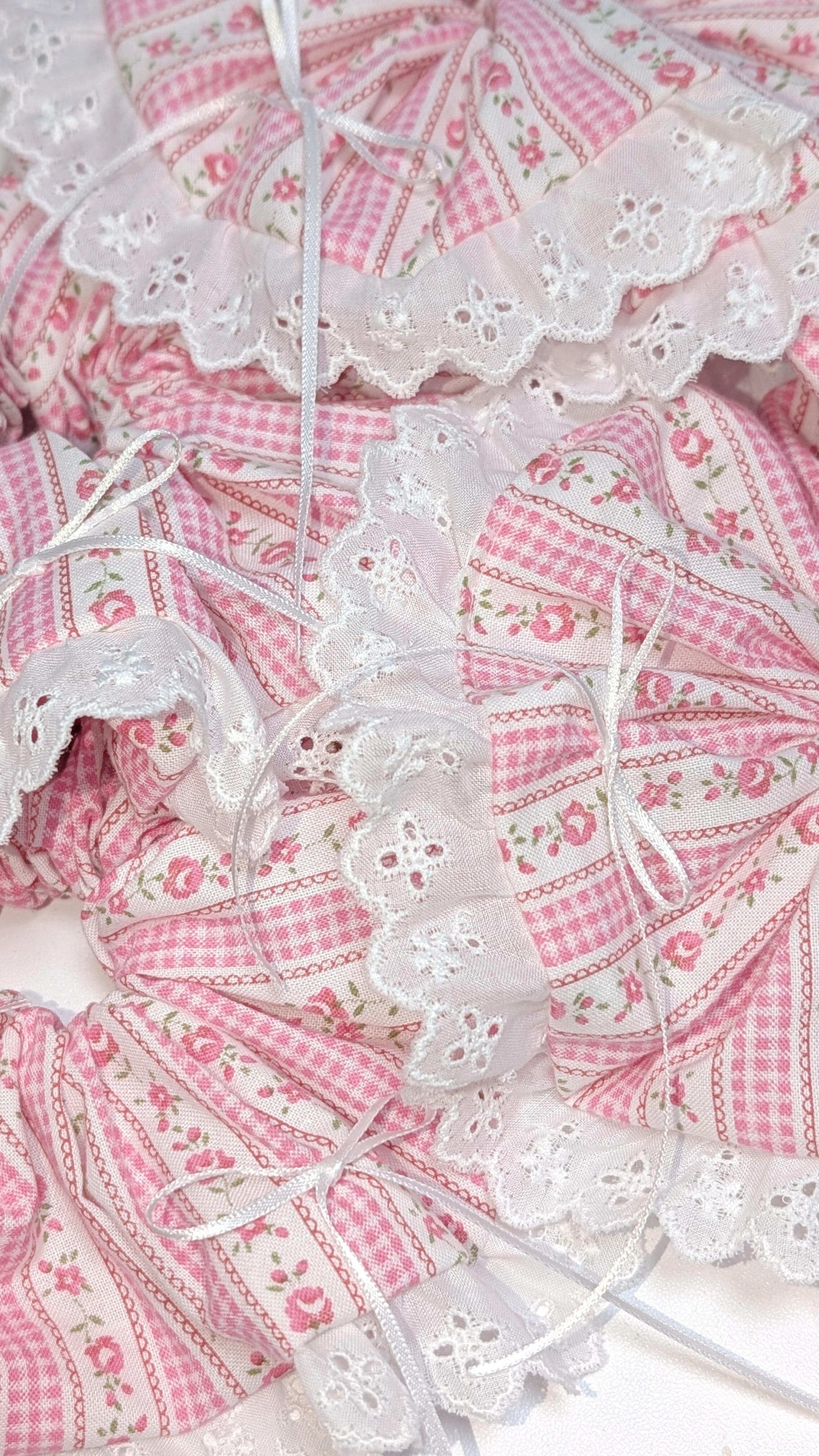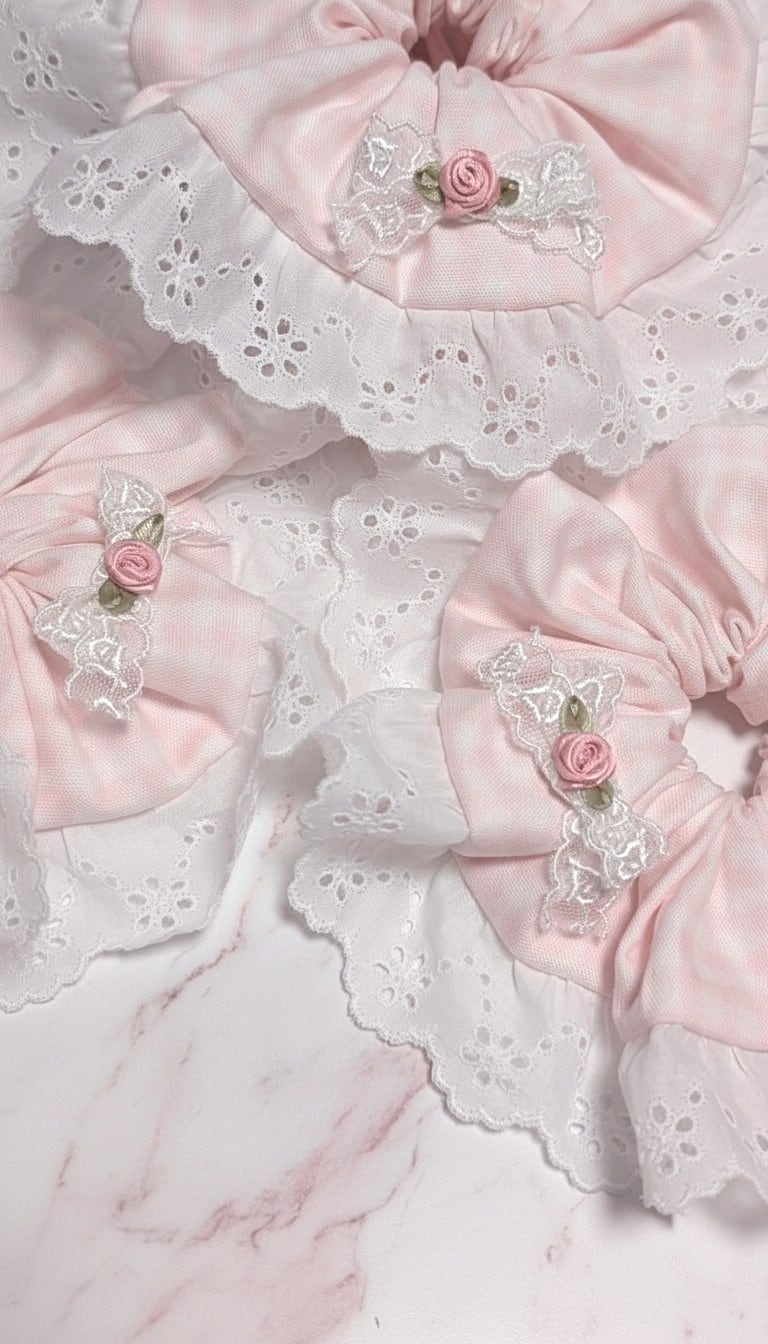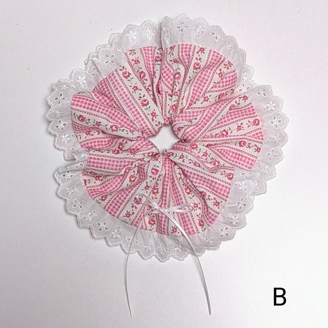 ROSE CLUBらしい華やかなデザインの生地とフリルの組み合わせのシュシュ